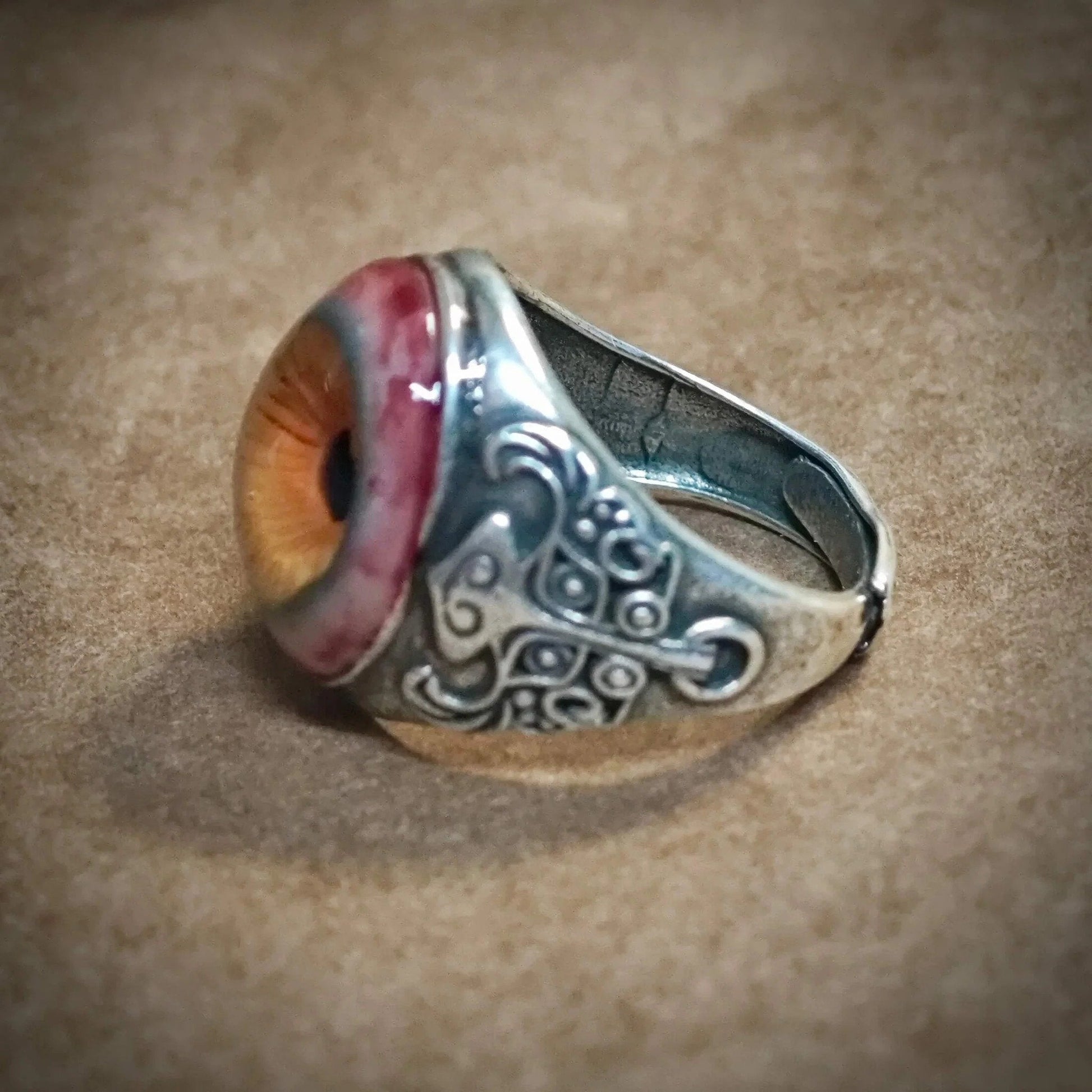This Ring is a captivating handcrafted piece, featuring a lifelike eyeball design with a rich brown iris, a deep black pupil, and intricate blood vessel detailing.